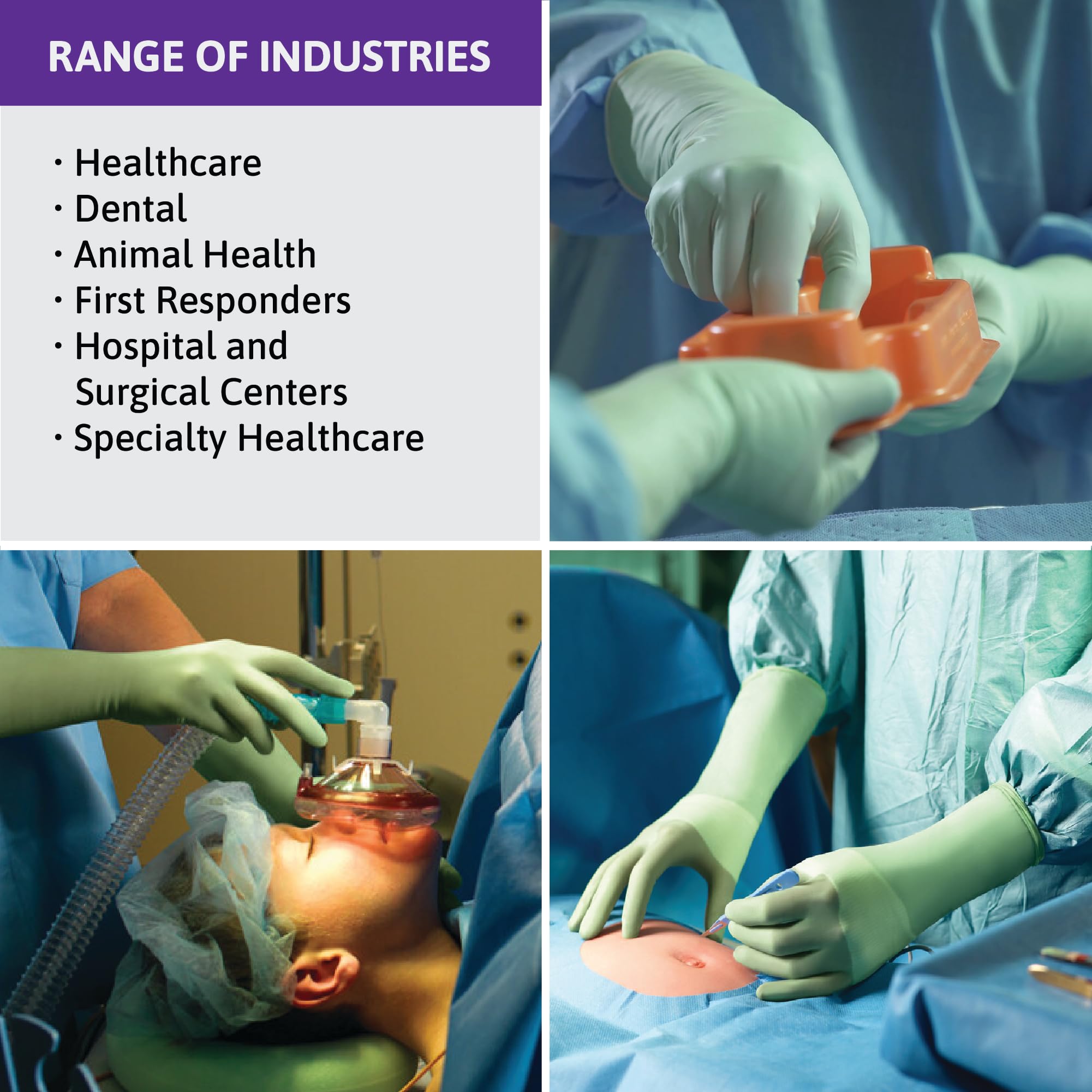 - Sterile gloves available in sizes 5.5, 6, 6.5, 7, 7.5, 8, 8.5, and 9