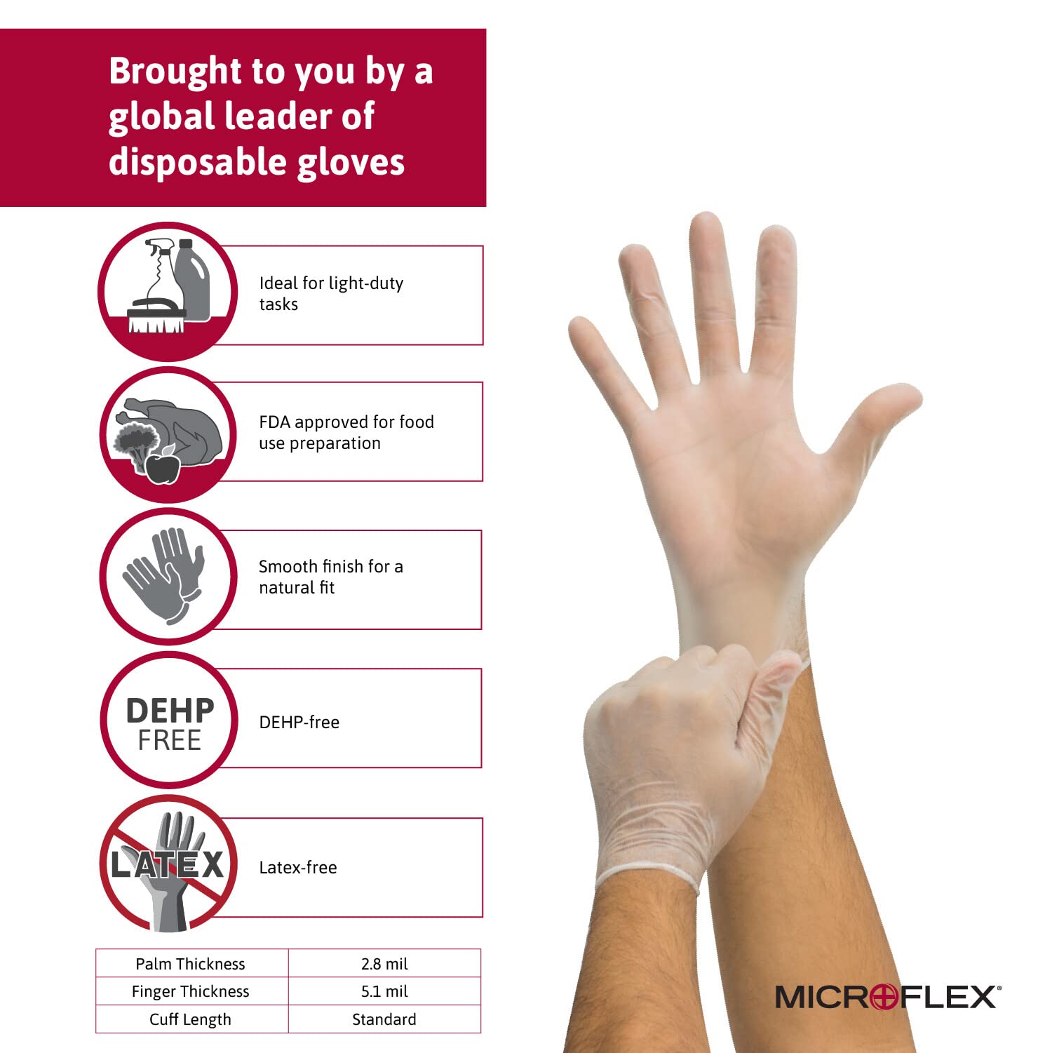 Ansell MICROFLEX V28 Disposable Powder-Free Vinyl Gloves for Food Processing, Light Cleaning w/Smooth Surface—