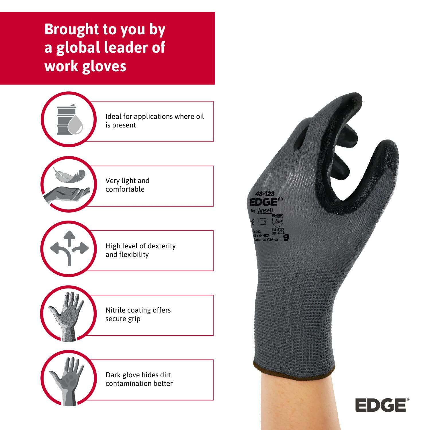 EDGE 48-128 Knitted Nitrile Coated Industrial Gloves w/Palm Coating for Automotive, Machinery - Black